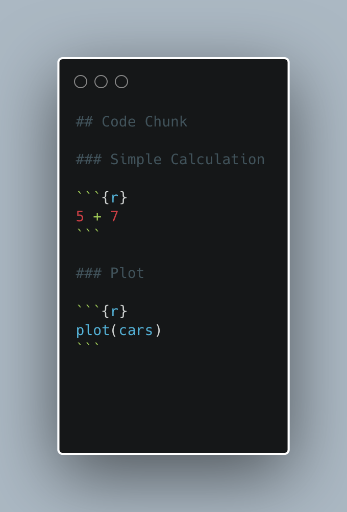 3. Manually type the chunk delimiters ```{r} and ```.