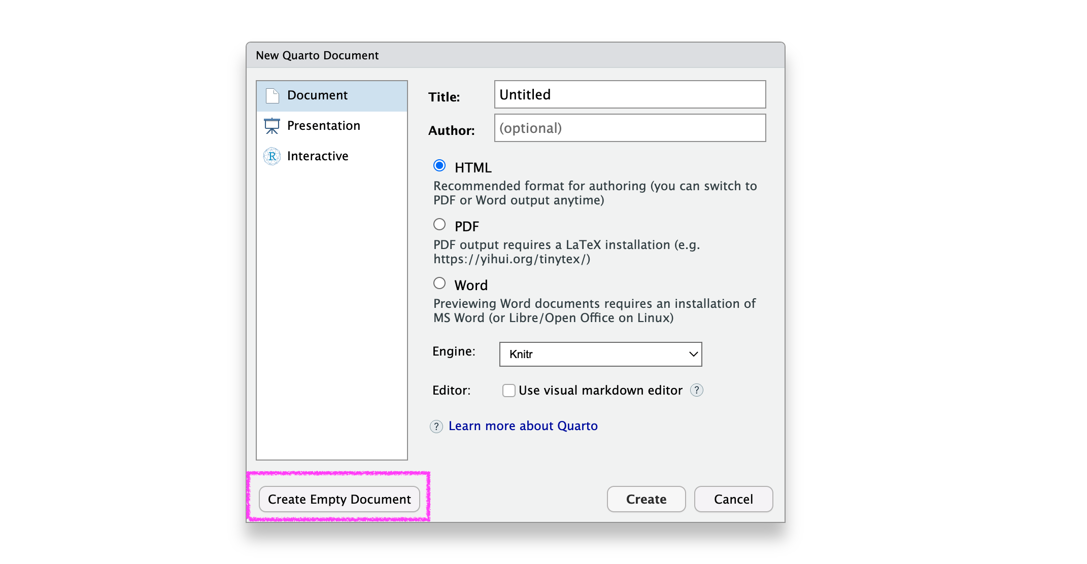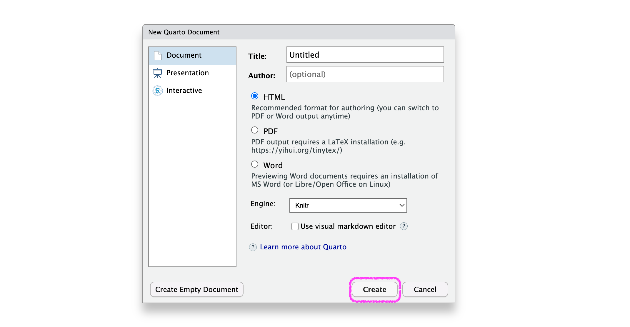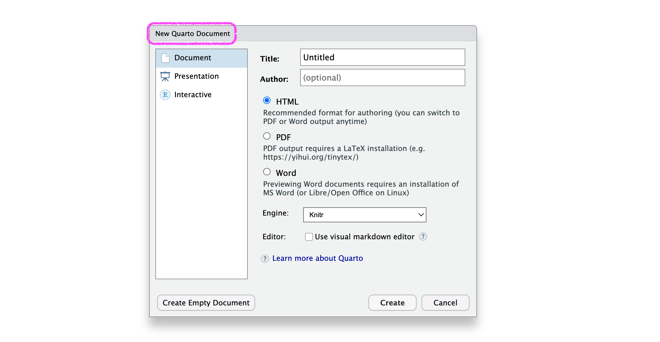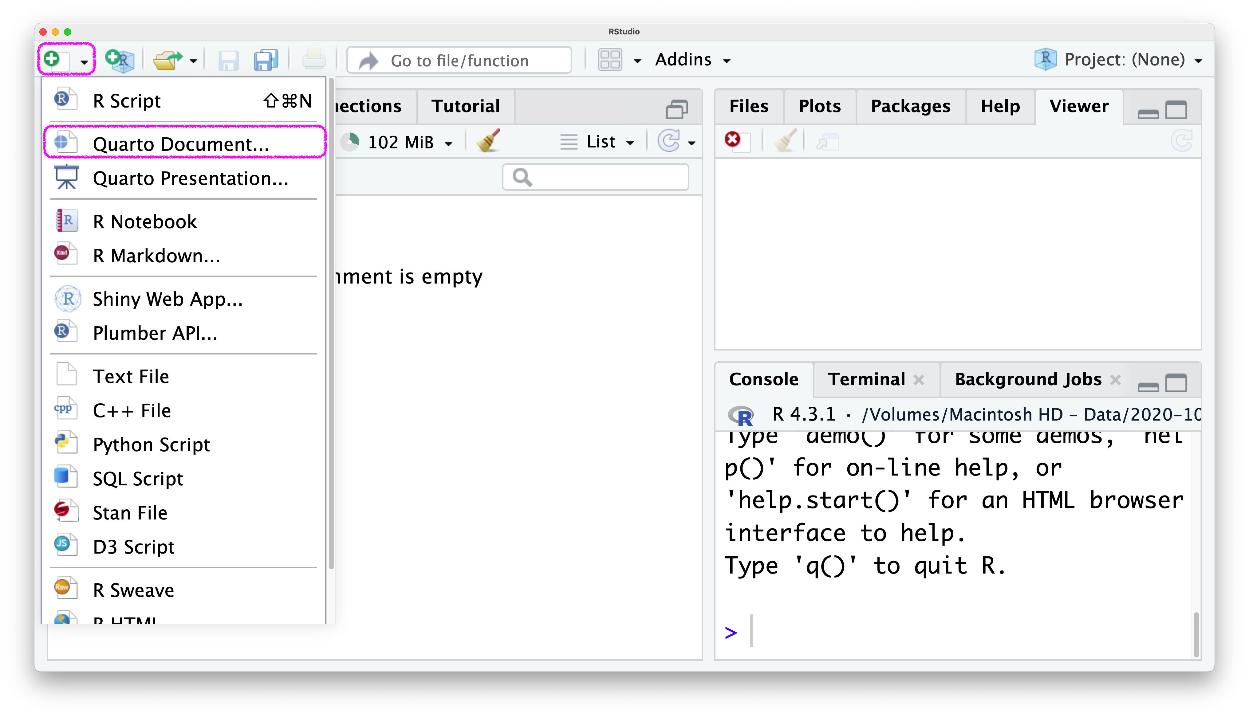 File \(\rightarrow\) New file \(\rightarrow\) Quarto document