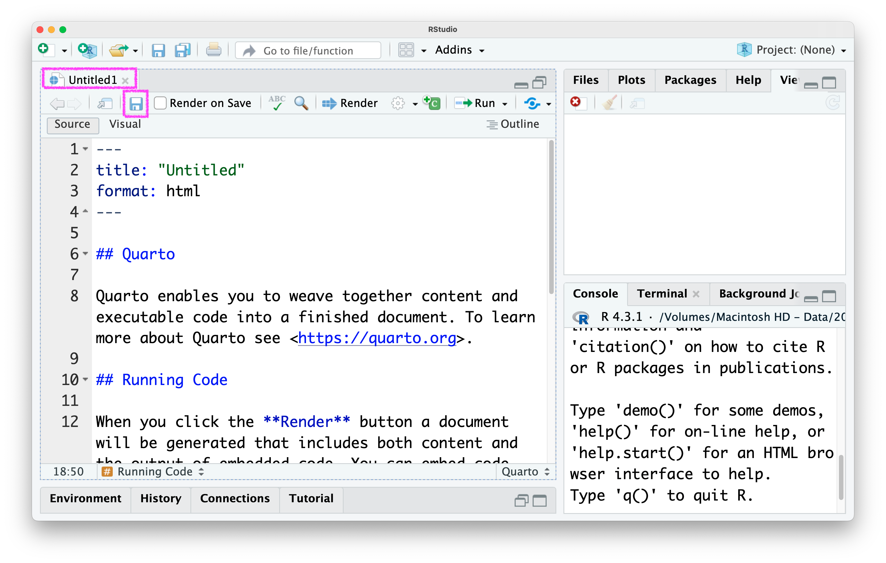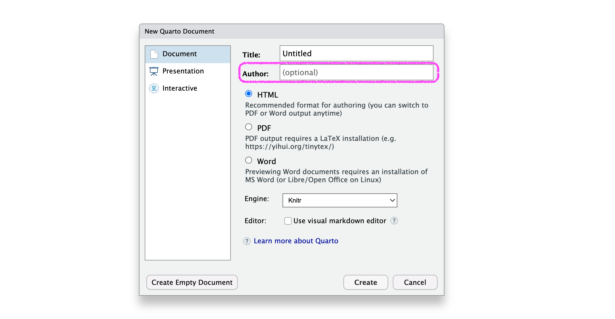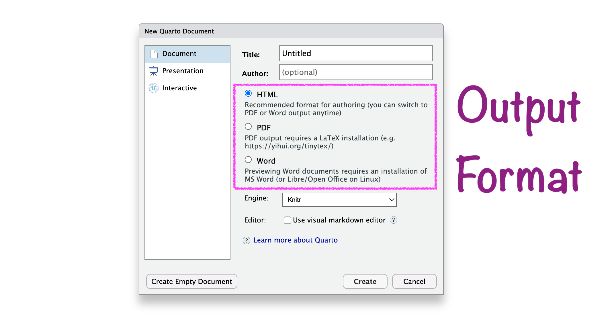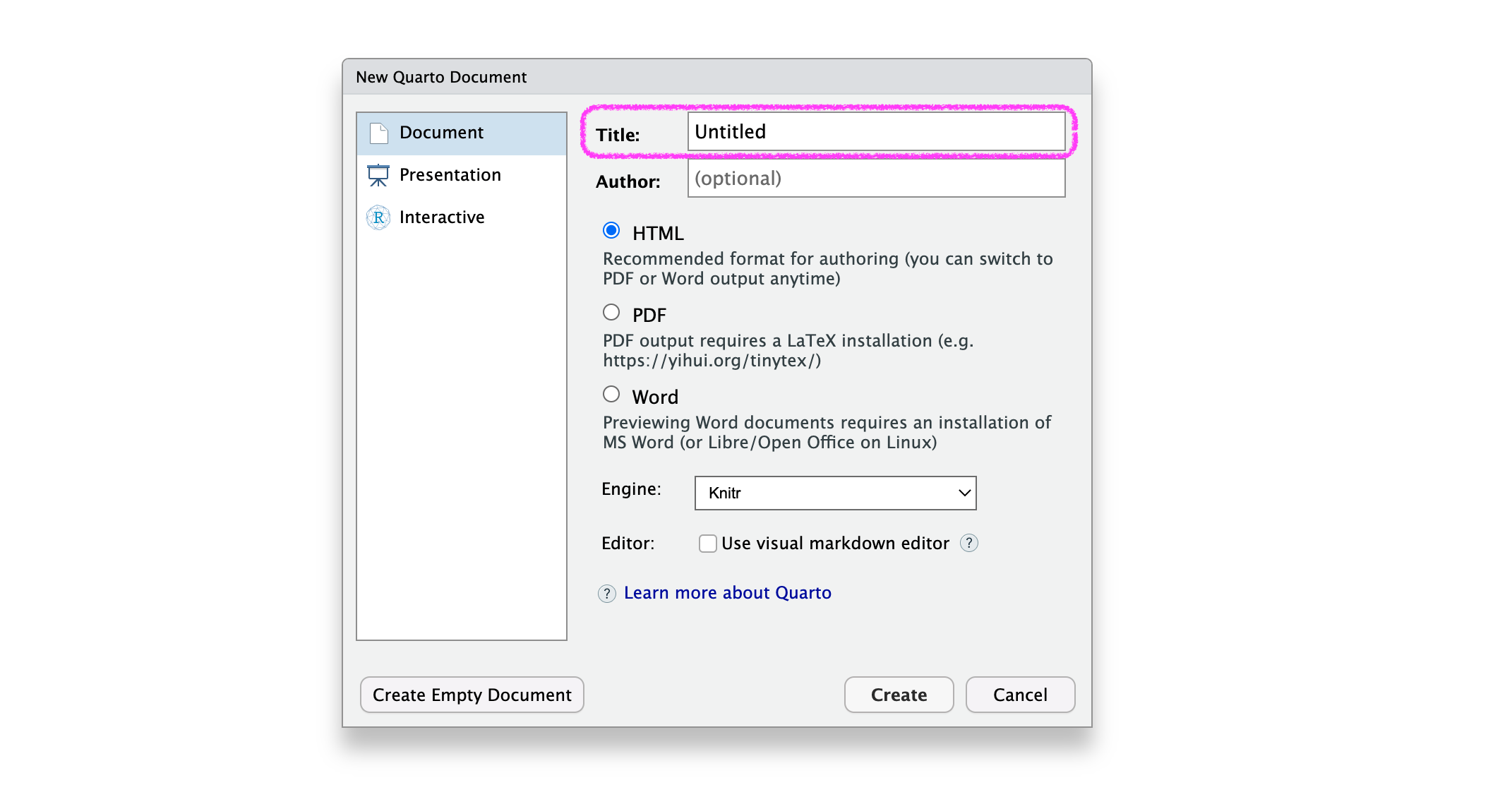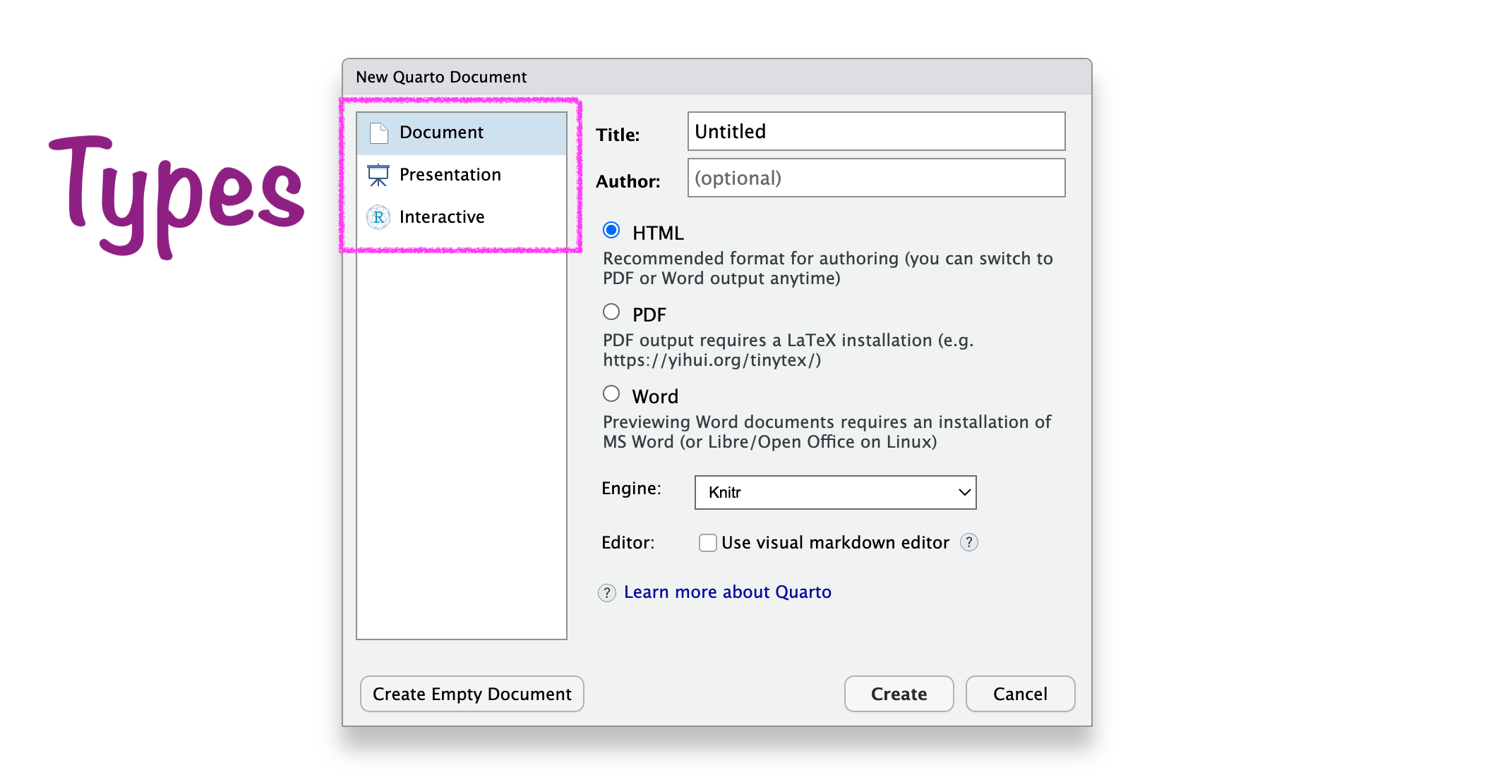 File \(\rightarrow\) New file \(\rightarrow\) Quarto document