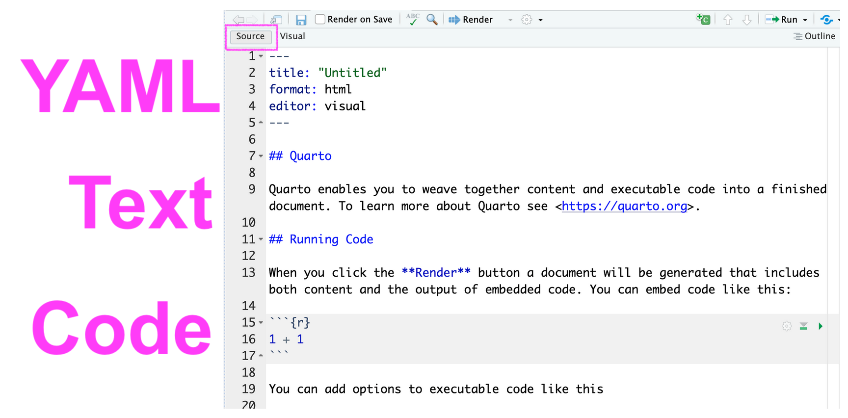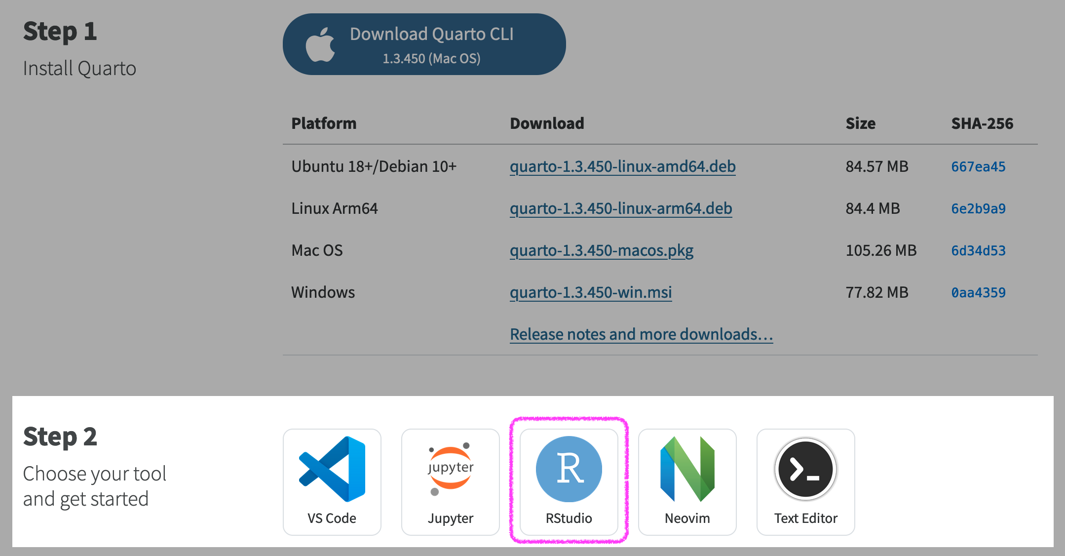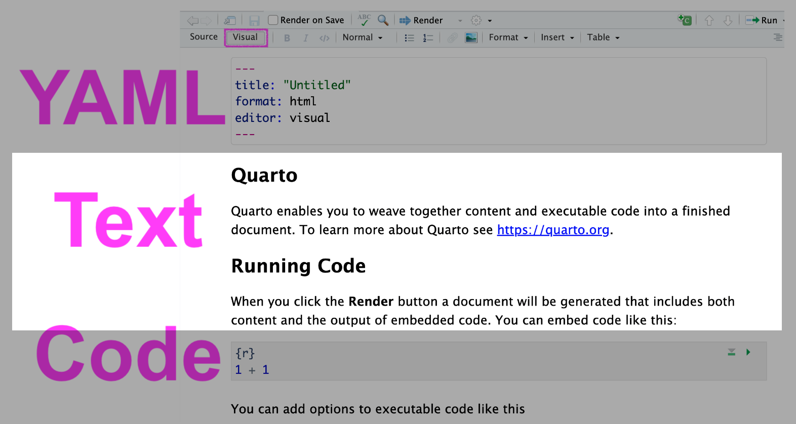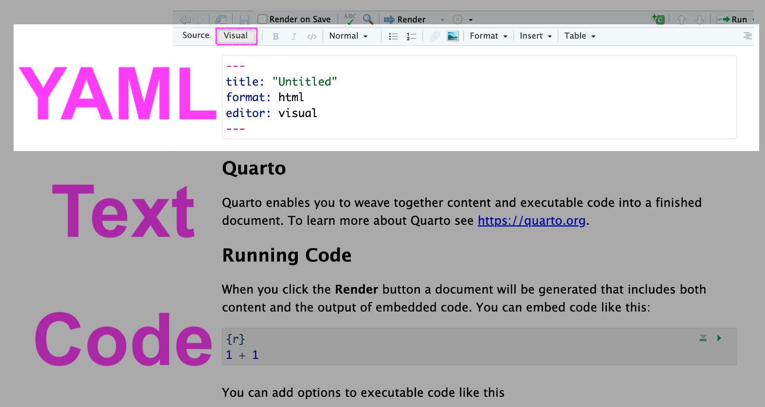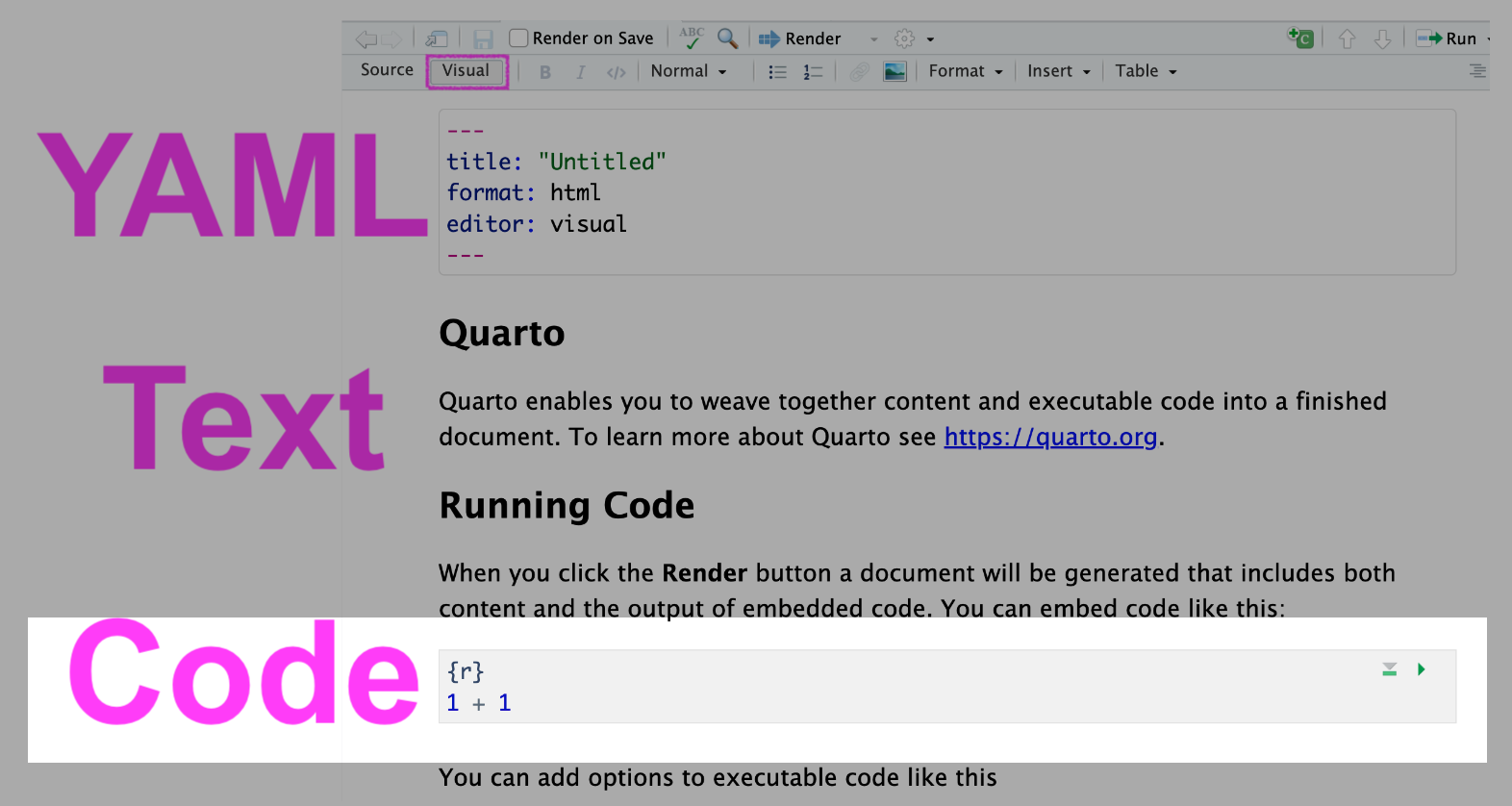 Quarto sends the .qmd file to knitr, which executes all of the code chunks and creates a new markdown (.md) document which includes the code and its output. The markdown file generated by knitr is then processed by pandoc, which is responsible for creating the finished file.